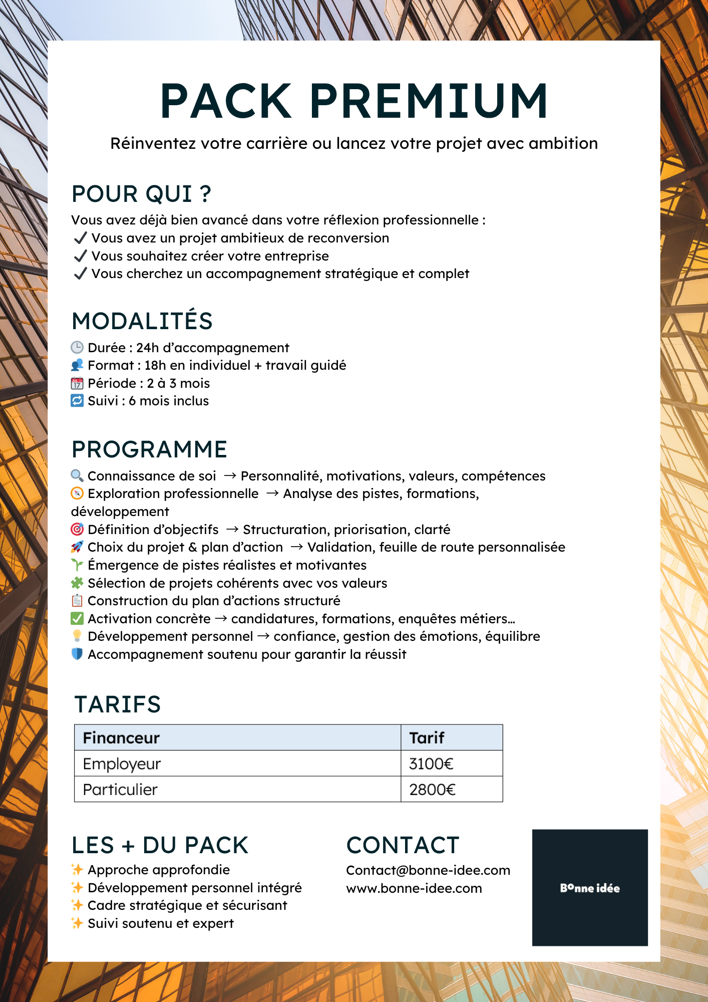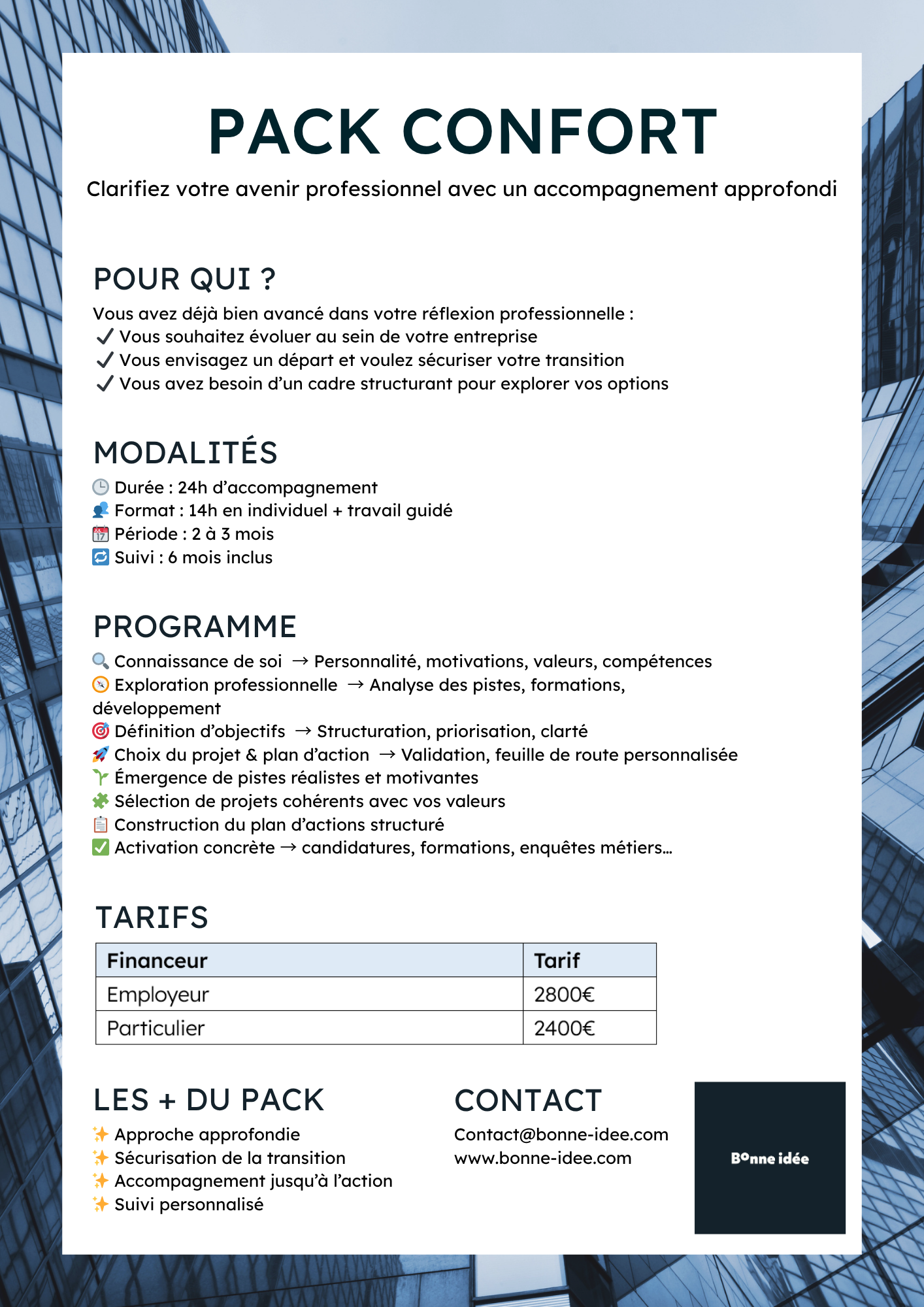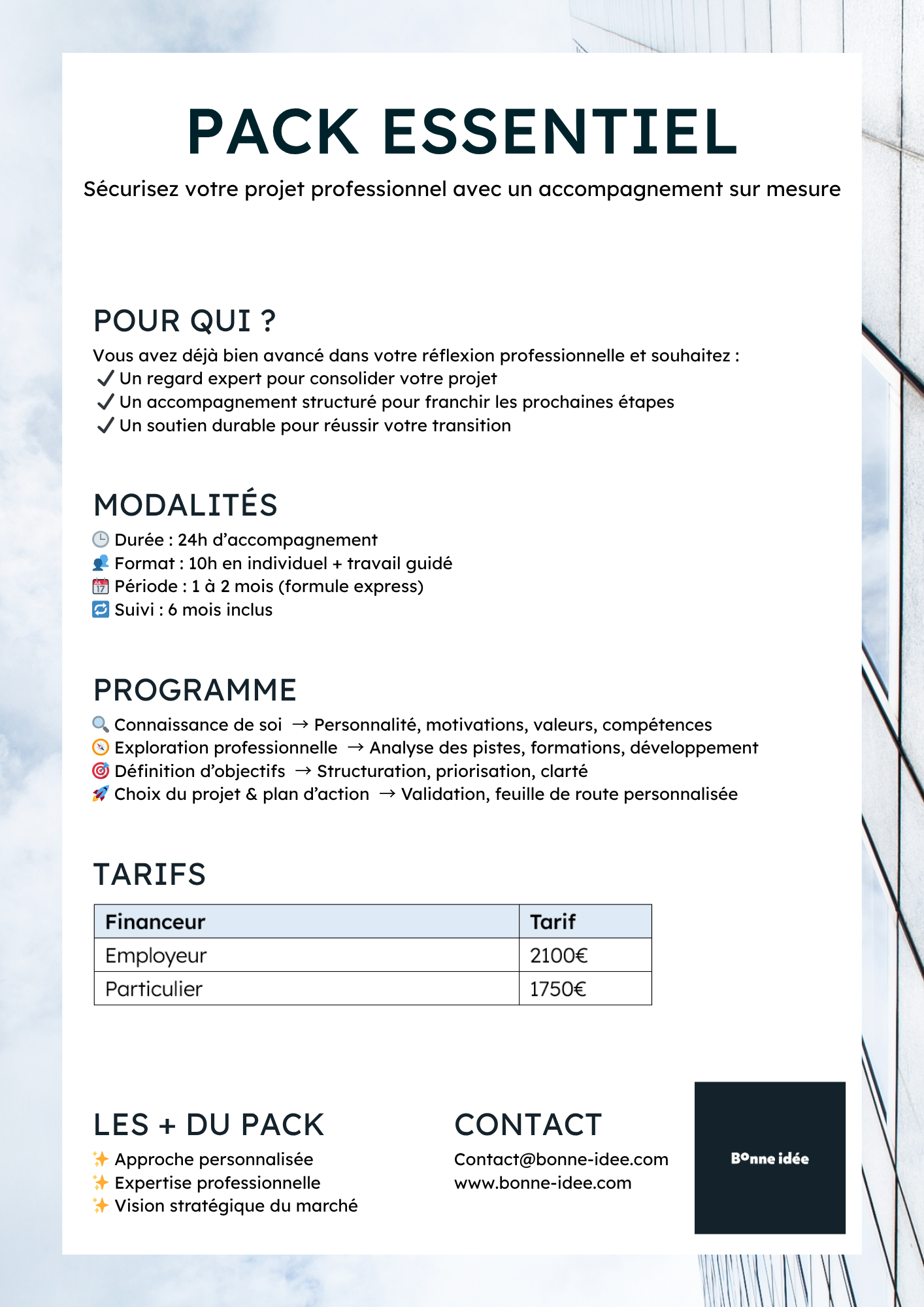 Au-delà de la réflexion, le bilan de compétences Bonne Idée est conçu pour vous mettre en mouvement. Vous gagnez en clarté sur vos forces et vos envies, en confiance dans vos capacités, et vous repartez avec un plan d’action concret et réalisable. - un accompagnement engagé et respectueux de votre rythme,